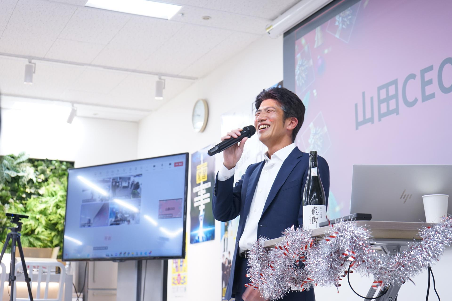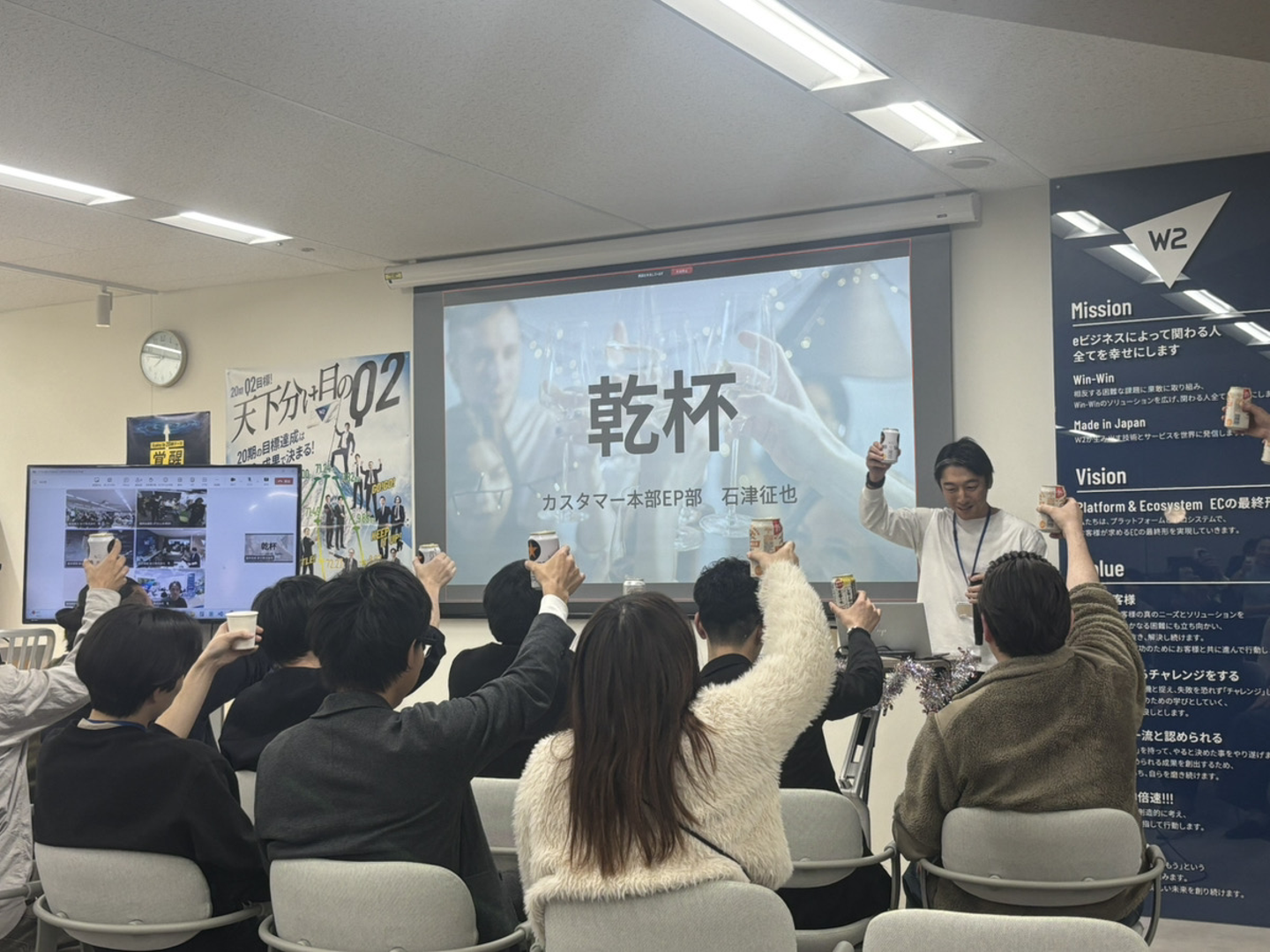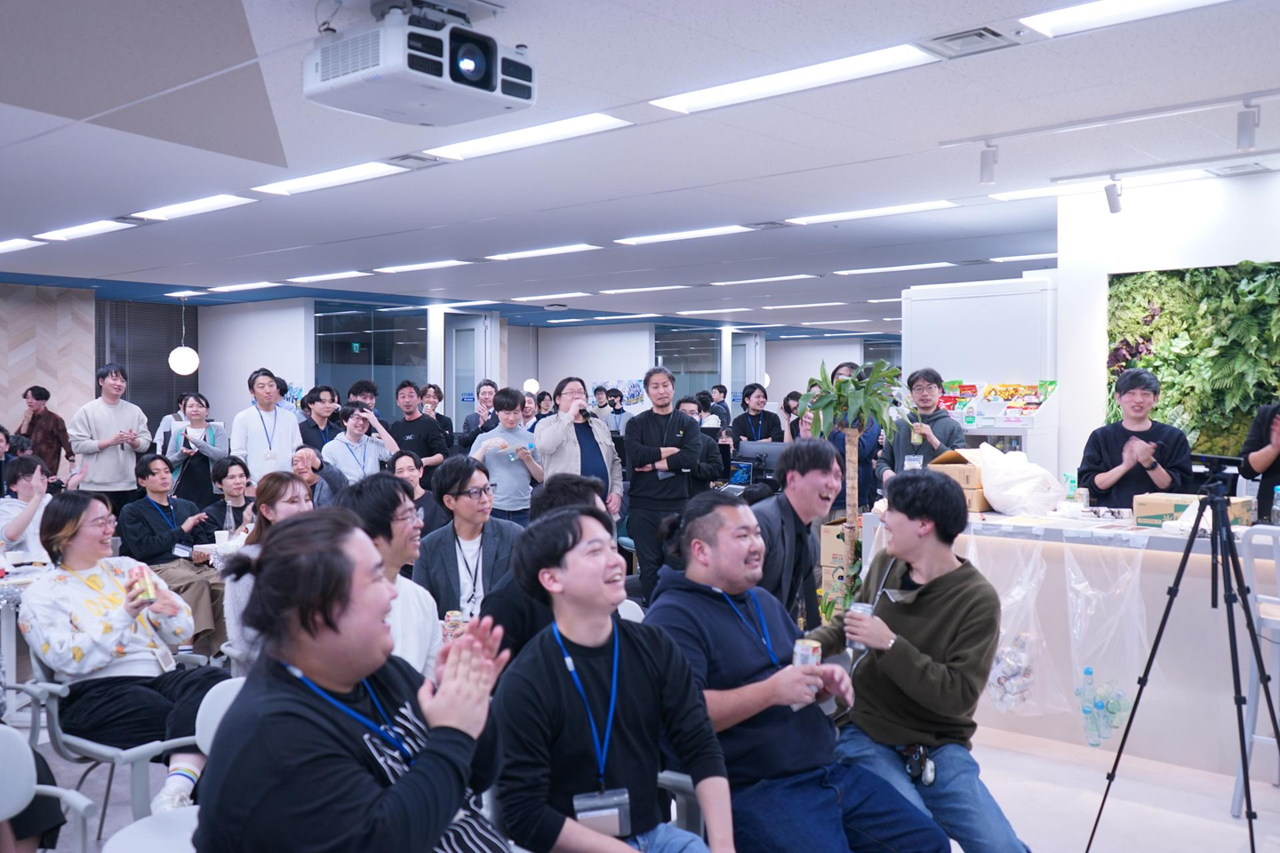 まずは開会の挨拶です。社員がイベントスペース周辺に集まり、司会者が最初から元気に盛り上げています!山田CEOから激励のコメントもいただき、担当者の掛け声で本編がスタートしました!乾杯!