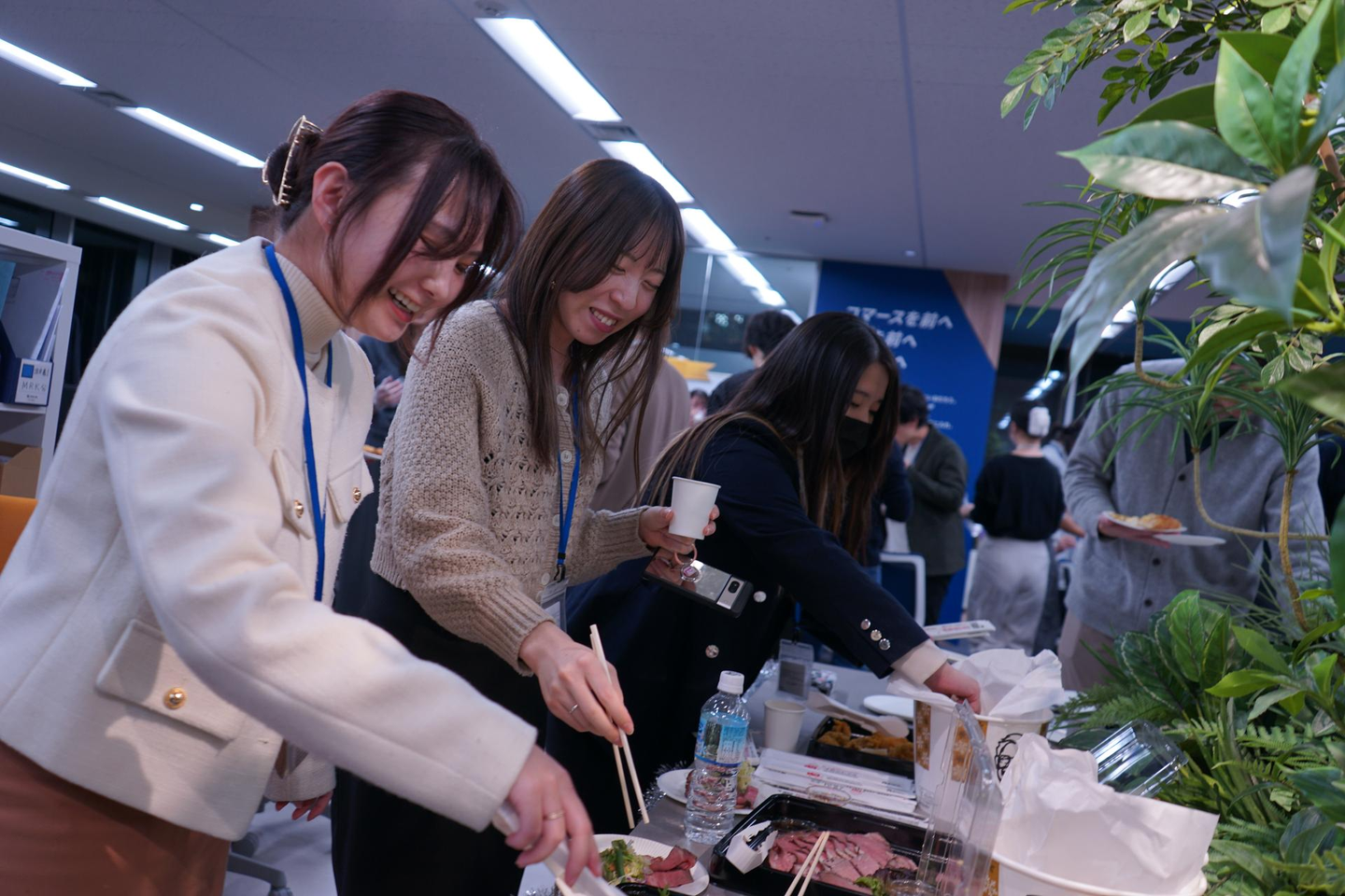 乾杯後しばらくは飲食、歓談を楽しむ自由時間です。部署や役職に関係なく、全員が好きなところに立ち、座り、思い思いに時間を過ごしていました。オードブル一番人気はローストビーフで、開会後あっという間になくなってしまいました!どの料理も美味しく、ビュッフェ形式でパーティー感が高まります。