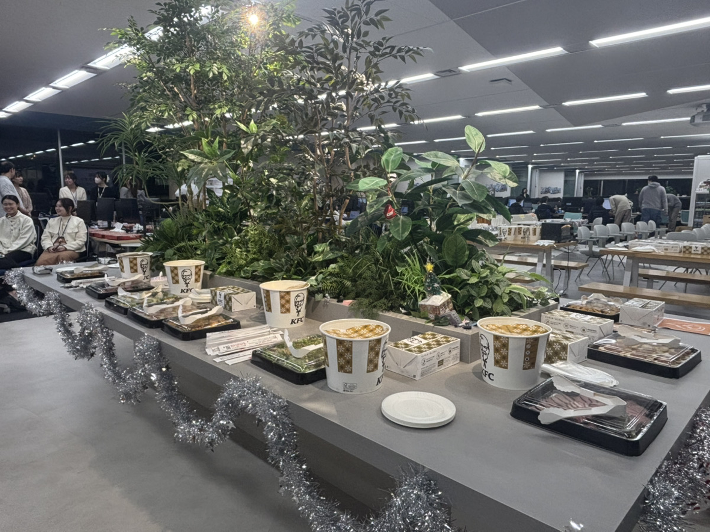 経営陣も参加して社員を労う会のため、他のイベントよりも多くの社員が参加するイベントです。用意される食事もサラダやローストビーフなどのオードブル、ピザ、フライドチキンなど複数の種類があり、しっかりとお腹を満たすことができる内容でした!