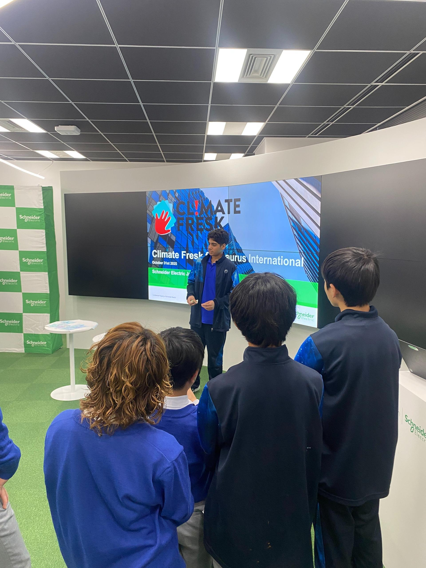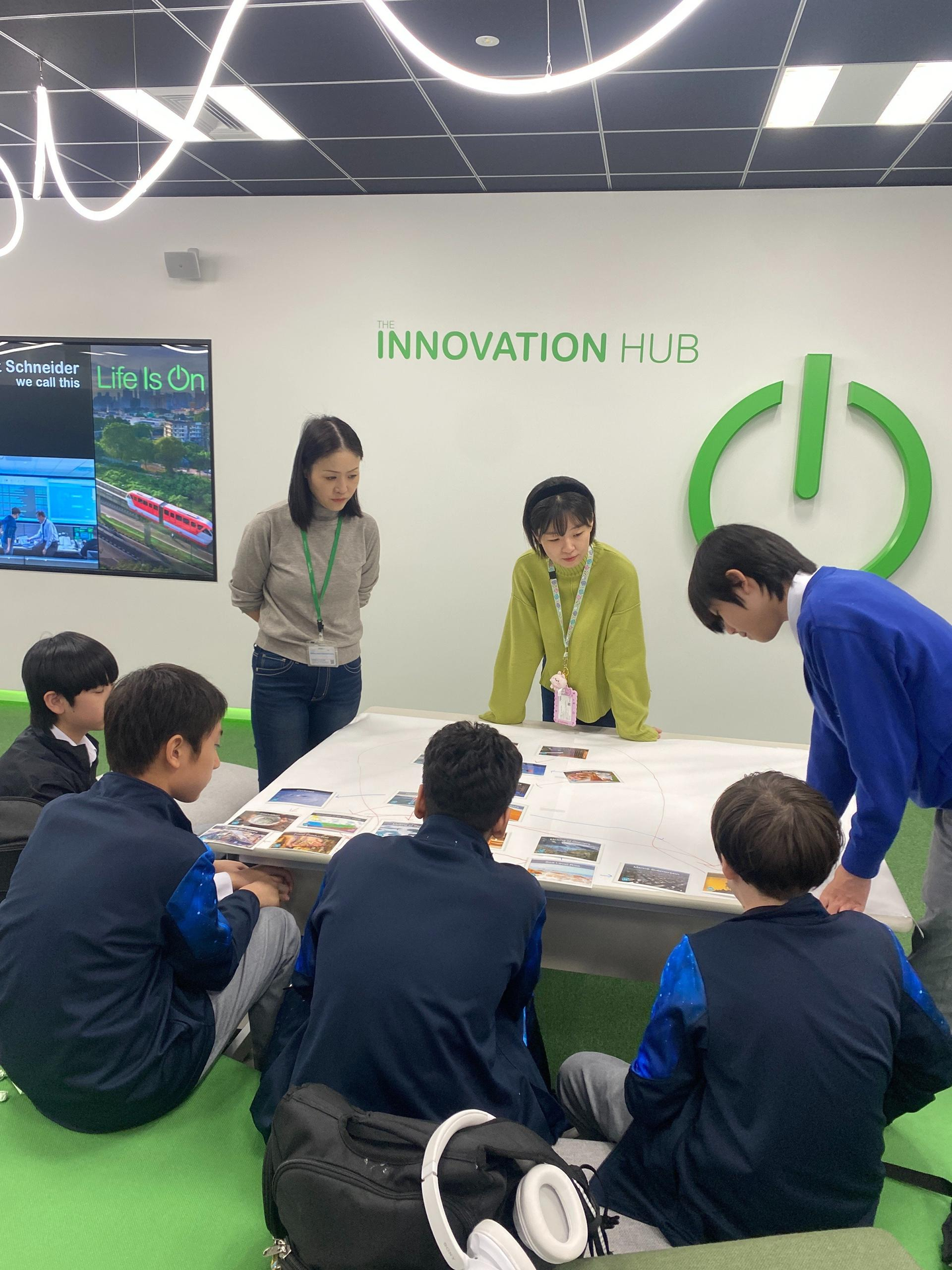 今回はLaurus International School of Scienceの中学一年生の生徒を最近東京オフィスに新しくできたInnovation Hubというシュナイダーの様々な製品やソリューションを展示しているブースにお招きし、Climate Freskを使ったワークショップを実施しました。今回LaurusとClimate Freskを実施することになったきっかけ、以前出前授業を行い、学校からのフィードバックがよくさらに気候変動への理解を深めたいというものでした。 Laurus International School of ScienceはSTEM(理系分野) 教育に特化したインターナショナルスクールです。以前出前授業で講師を務めたメンバーがやはり小学生ながら、サイエンスの知見が普通より高かく感じたと生徒を大好評!そんな学生たちに今回は貴重なお時間を頂きハロウィンの日にクライメートフレスクを行いました。