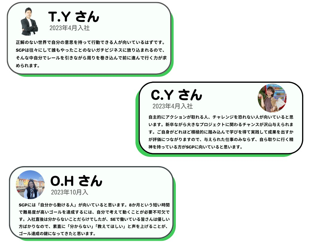 SGPは、ただの営業や技術者、管理職を育てるプログラムではなく、チャレンジを通して自分の力で将来を切り拓ける人を探しています!以下のようなキーワードにマッチする方にはピッタリのプログラムです!: