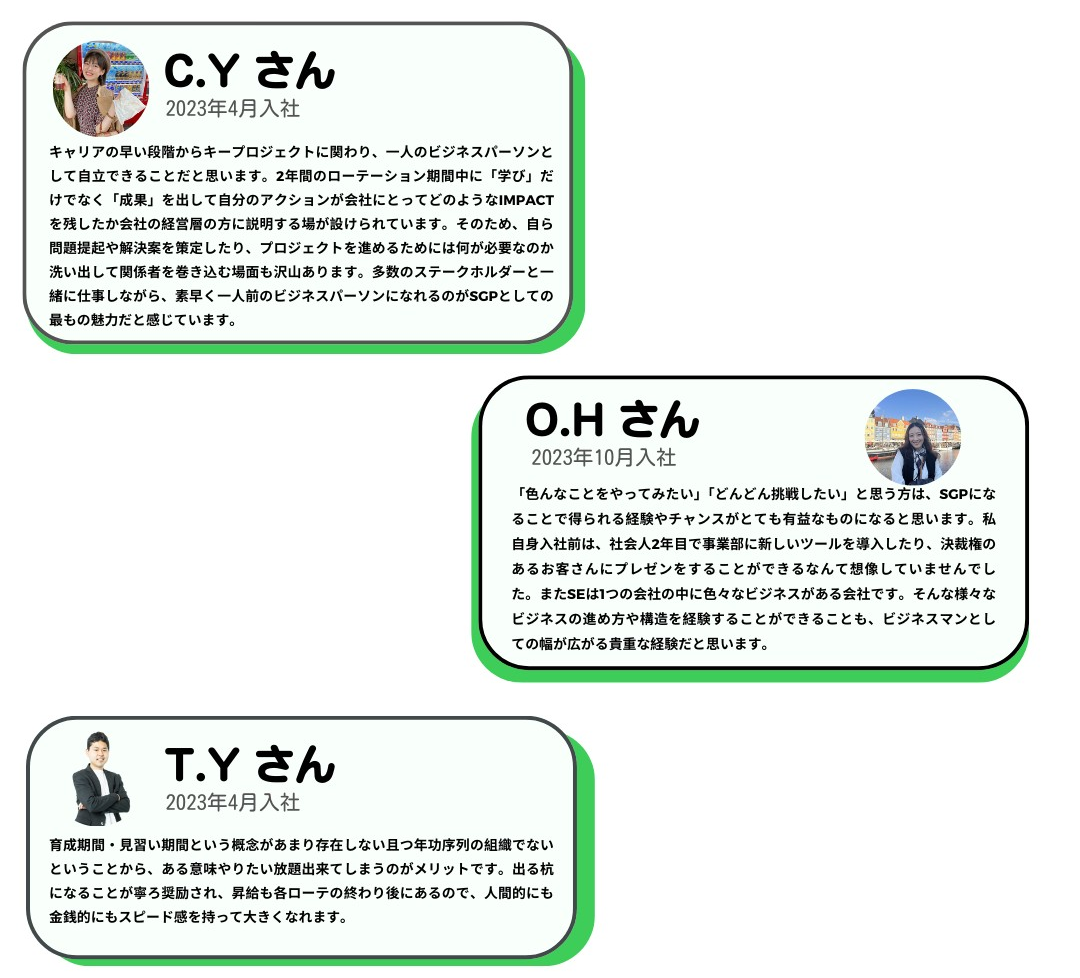 特にこの記事では、SGP卒業生や現SGP生のコメントを交えながら、プログラムの魅力や習得できるスキルについて紹介します。これから応募を検討されている方や興味をお持ちの方、また選考プロセスに進まれる方にとって、SGPの魅力や実際の体験談が参考になれば幸いです。