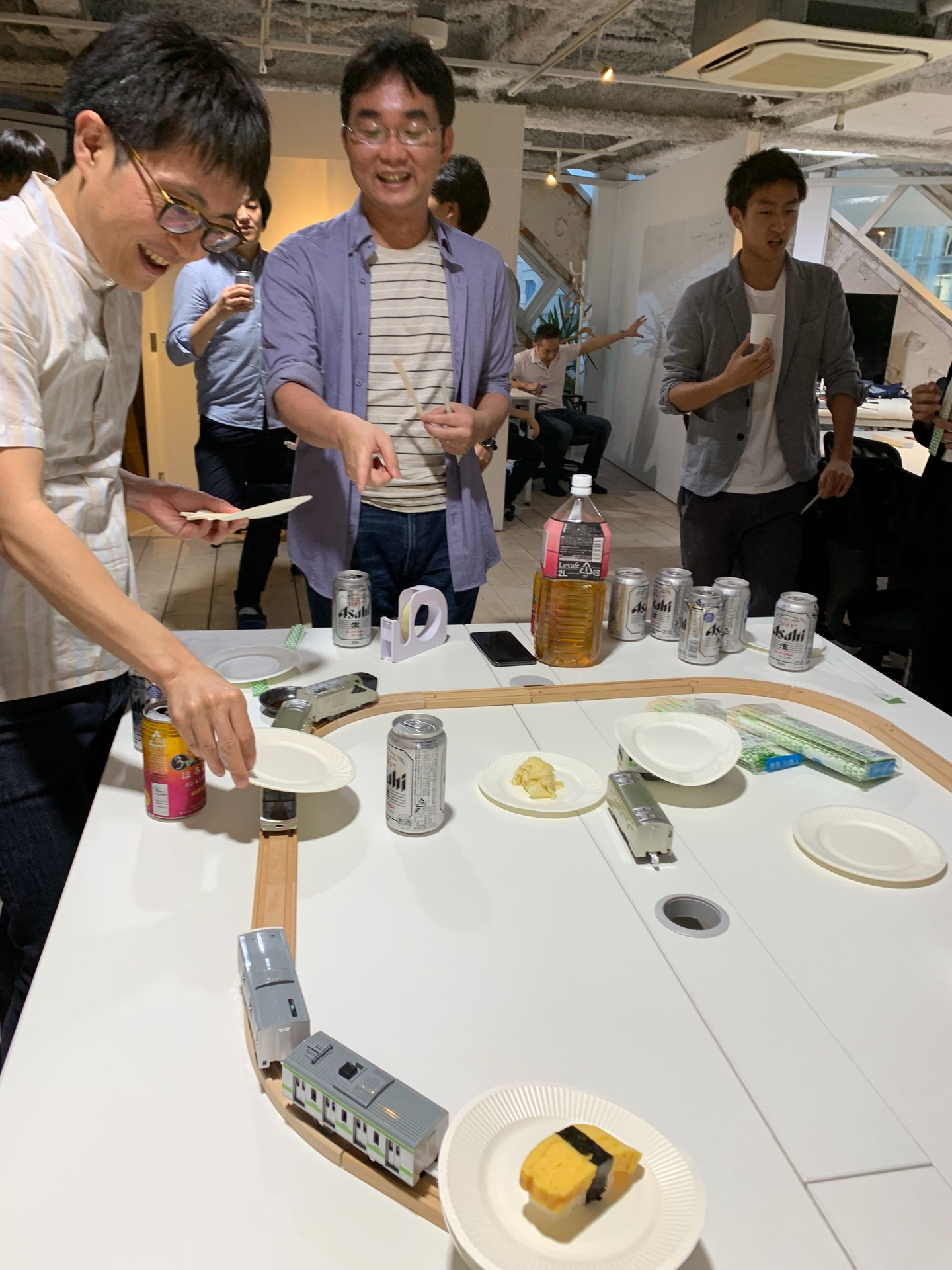 会議後は待ちに待った懇親会!毎回メンバーが声をあげてくれ、得意料理を披露してくれたり、プラレールに寿司を乗せて回してみたり楽しい時間はすぎて行きます。