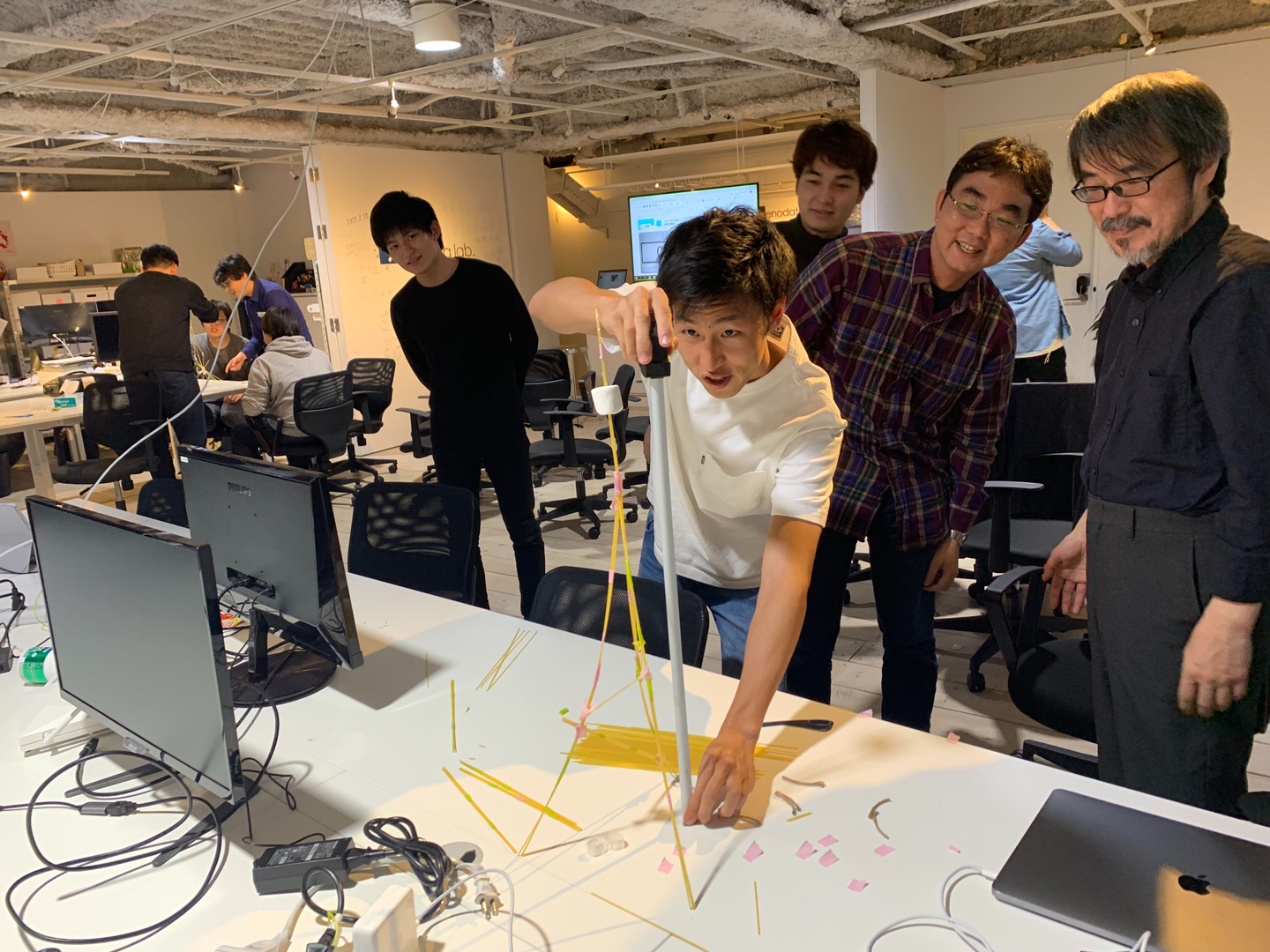 『マシュマロ・チャレンジ』というパスタ、テープ、ひも、マシュマロを使い自立可能なタワーを立てるというWSをして、チームビルディングを図りました。