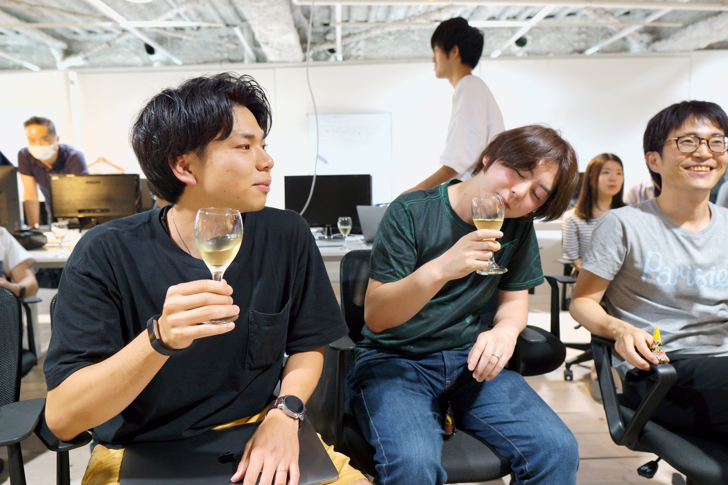 グラスを片手に会議です。(大丈夫です、真ん中のメンバーは寝ていません。)