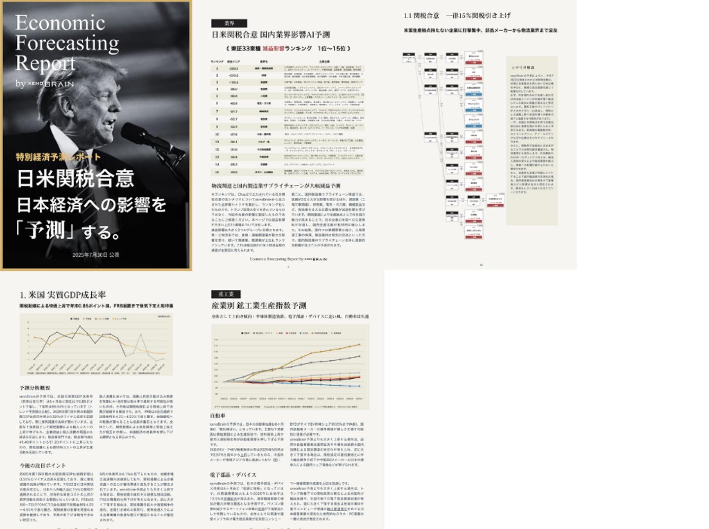 弊社が提供する経済予測プラットフォーム「xenoBrain(ゼノブレイン)」では、7月23日に発表された日米関税協定を受けて、日本経済への中長期的な影響をAIで定量的に分析しました。その結果をまとめた特別レポートを、このたび無料で公開しています。
