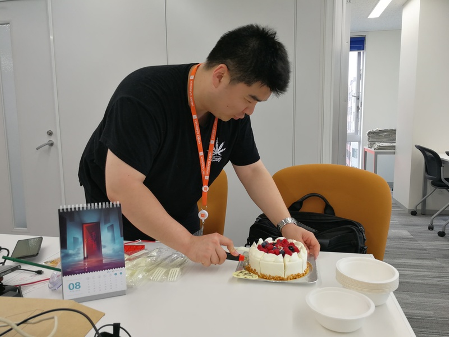 誰も切ってくれないので、自分でケーキを切る安さん。癒やされます。