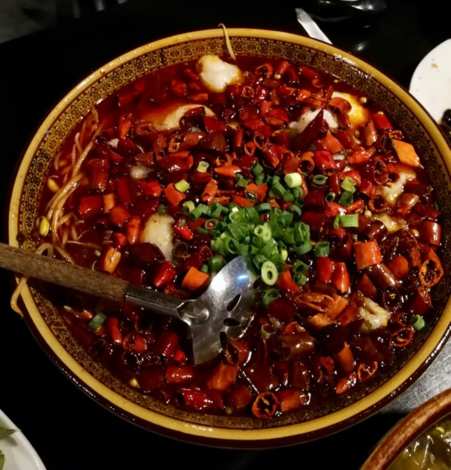 圧倒的な唐辛子感。唐辛子が語りかけます、赤い、赤すぎる……という感じ。歴史上、これほど赤い料理があったでしょうか。たぶん地獄ってこんな感じなのでしょうね。器からはみ出たもやしが、地獄の釜からの脱出を試みる罪人のようにも見えてきますよね。