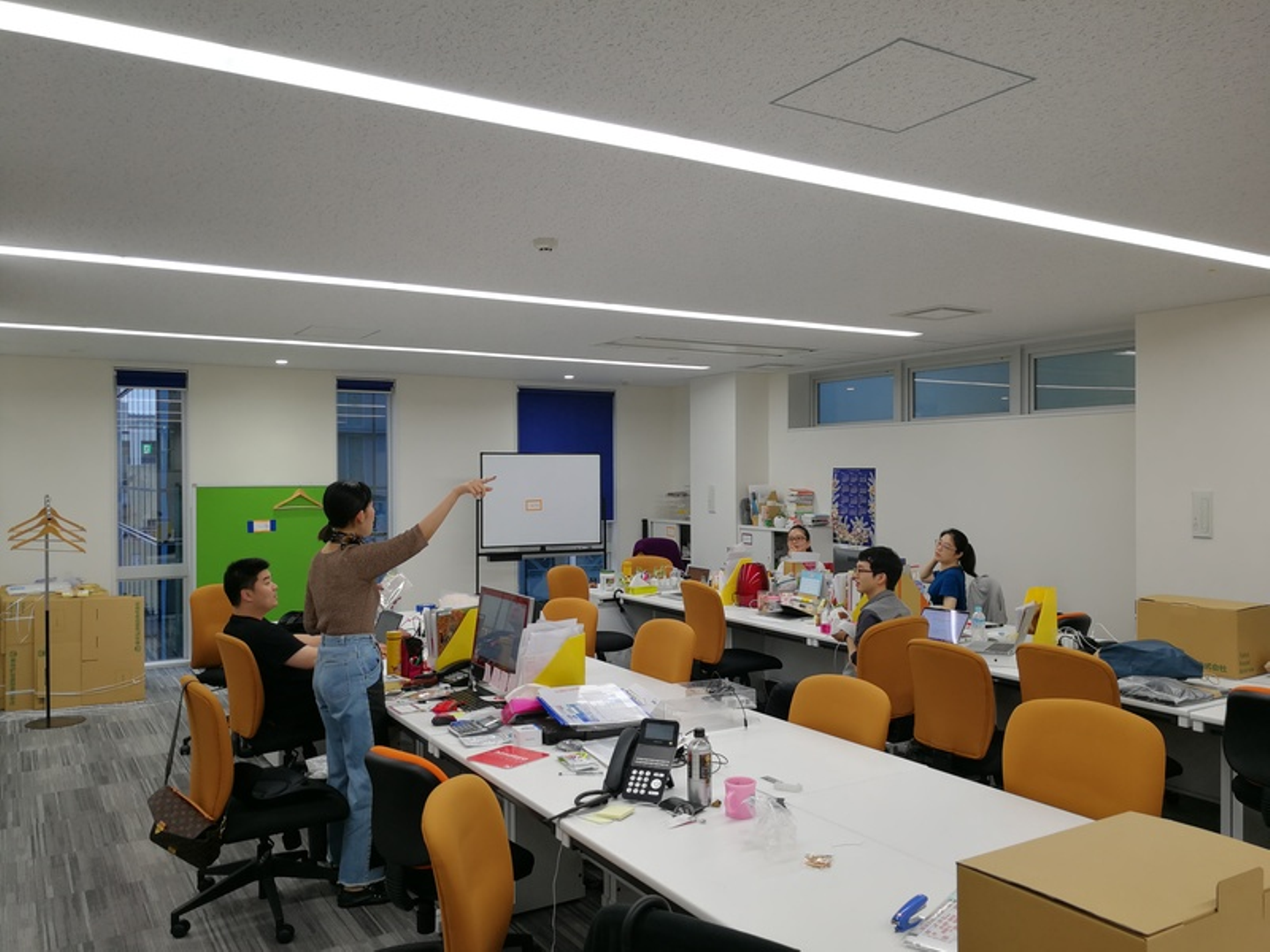何らかのお話をしている総務・人事の孫さん。みんなの視線を独り占めしています。なんか散らかっているように見えますが、いつもこうなのではなく、オフィス改装前だからです。本当です。