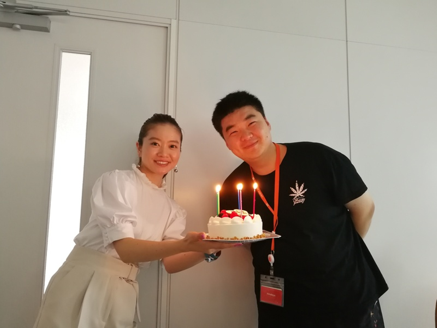 バースデーケーキを前にニッコニコの安さん(と、シマラヤジャパンのマスコットガール・茶谷さん)。写真では伝わりませんが、後ろではスマートスピーカー「小雅」から中国語の『Happy birthday to you』が流れています。そして……
