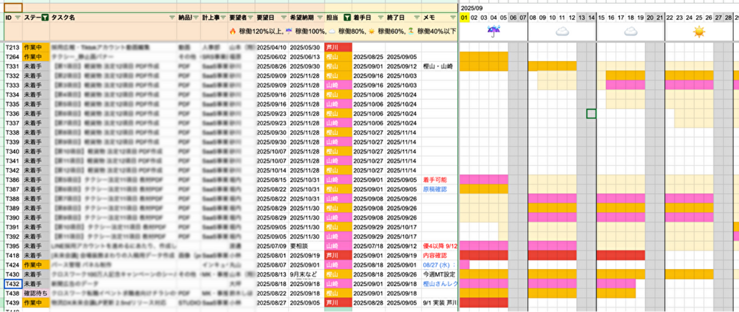 △毎週の稼働状況を天気予報に見立てて、全社に周知。稼働が偏らないよう工夫している。