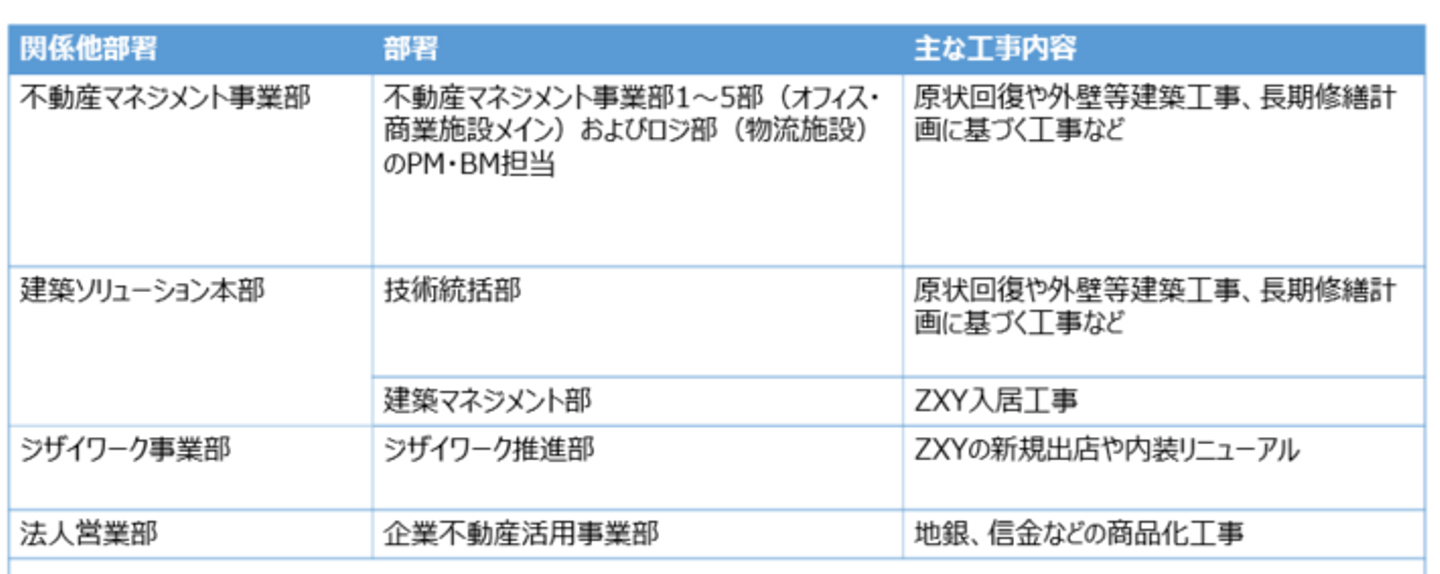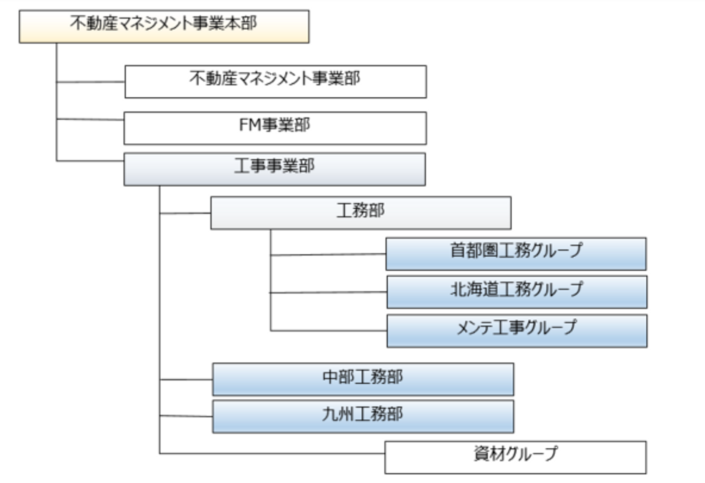 ザイマックスの不動産マネジメント事業本部から枝分かれする形で、工事事業部があります。