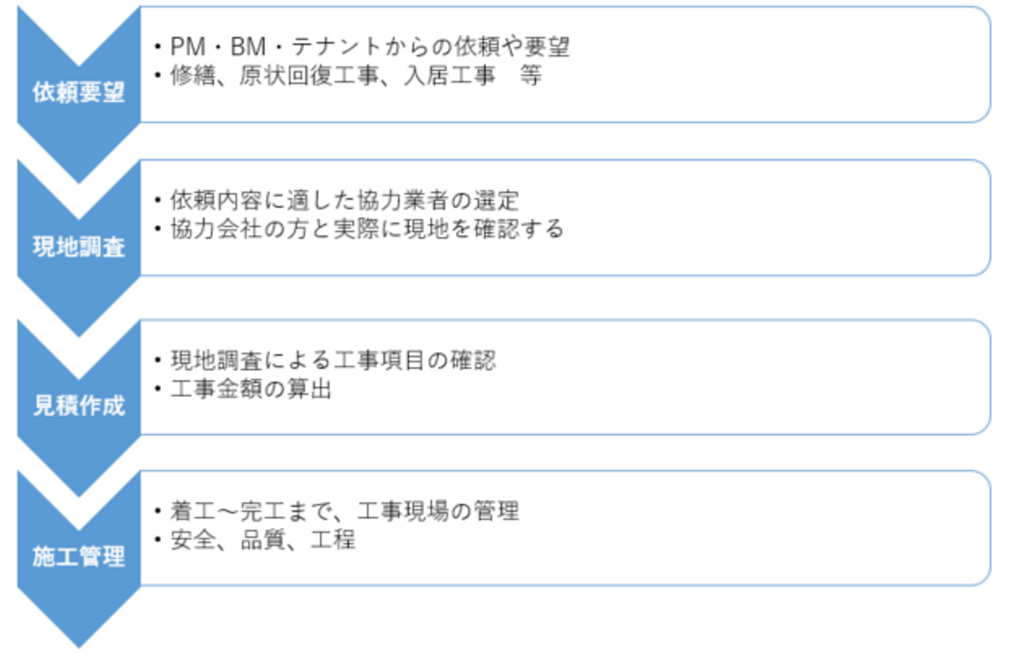 PMやBMからあがってくることがほとんどです。代行業務を行うPMから、ビルオーナー様・テナント様の依頼を伝えられます。