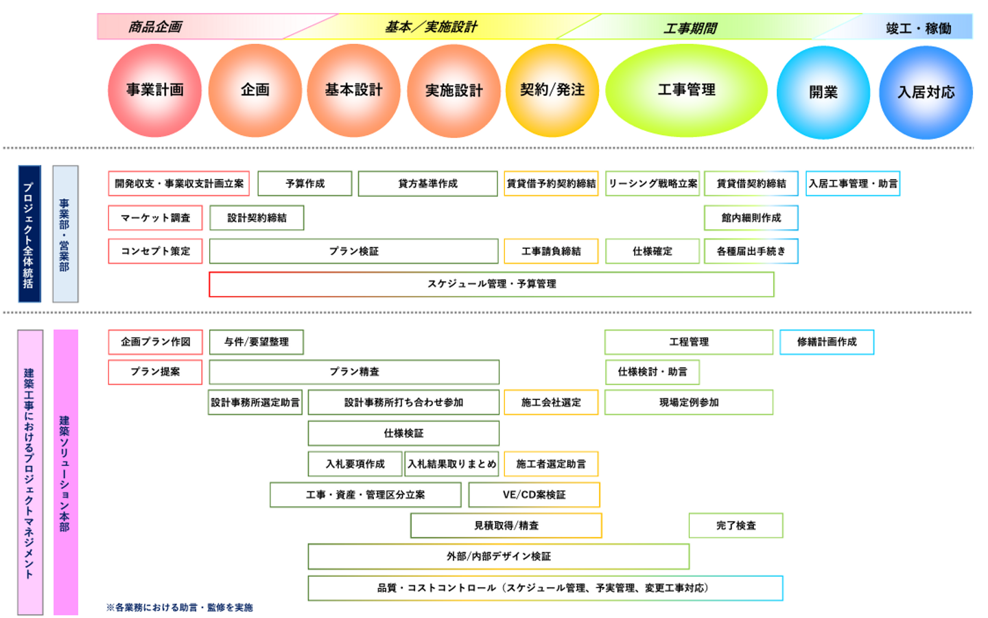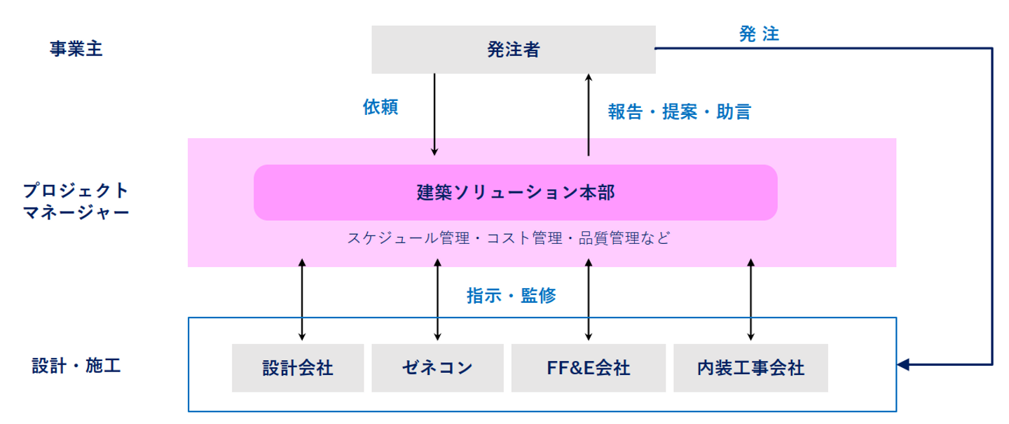 プロジェクト全体統括の事業部と連携をして、建設・入居工事を完成させるまでの管理業務(スケジュールや予算の管理、機能性や品質の確保、法令順守など多岐にわたる)を行い、プロジェクトを円滑に進める業務のことを指します。