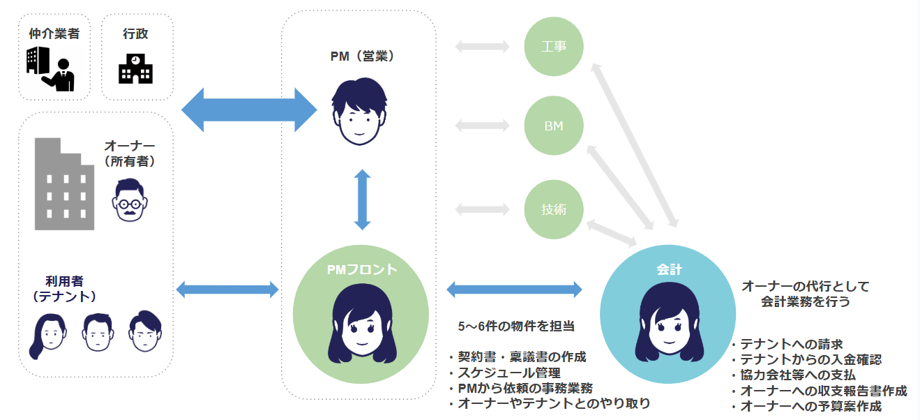 例えば、テナントが新しく入居するとなった場合、契約書の作成などは、PMフロントスタッフが行い、その後、契約書をもとに請求書の対応などを行うのが、会計スタッフの業務になります。