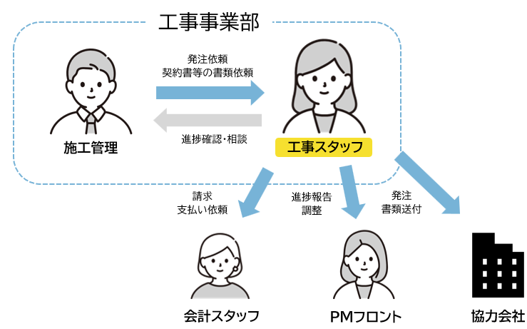 工事スタッフの仕事は、工事に関する事務業務全般を担当するポジションです。