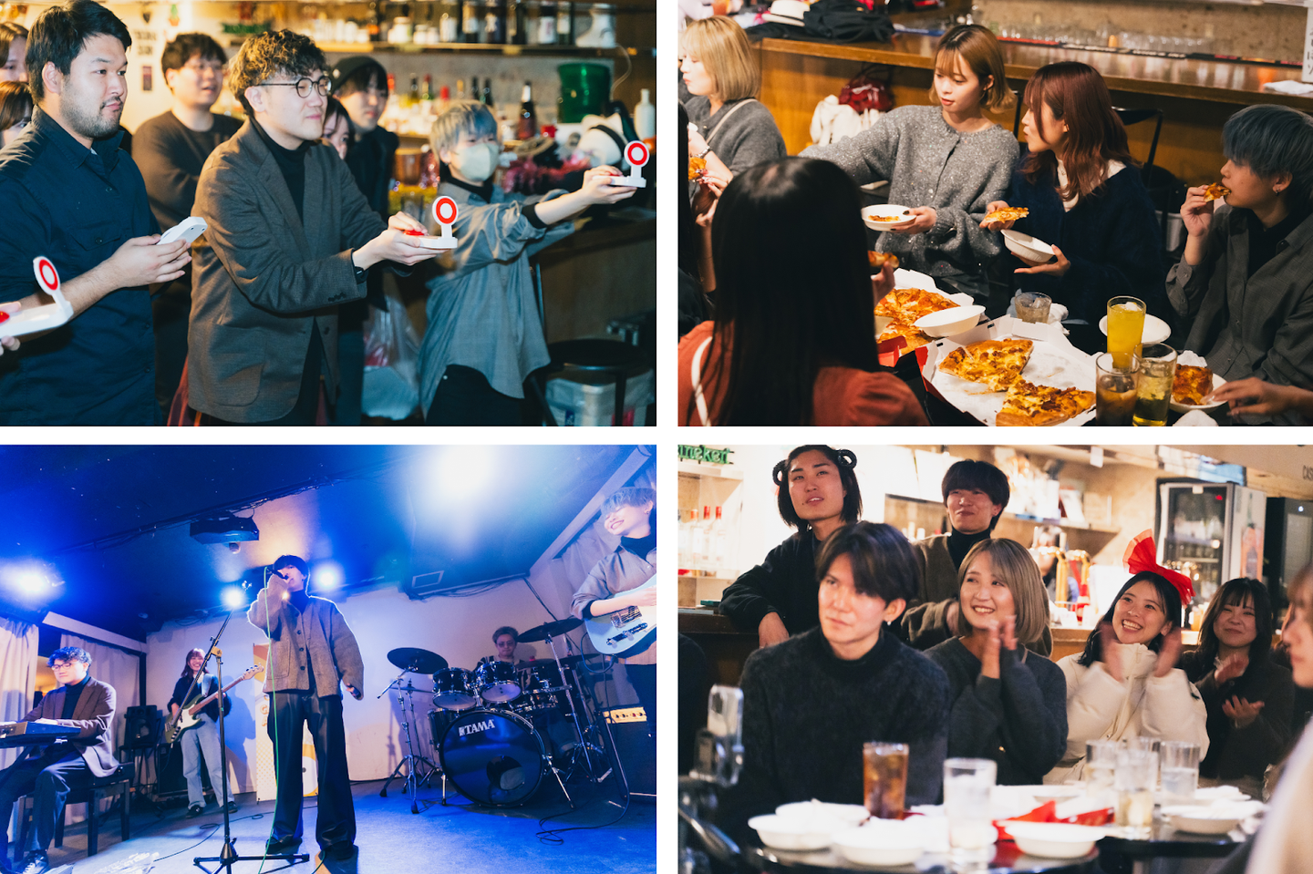 お酒や食事と共に、メンバーによるバンド演奏、チーム対抗クイズ大会など、様々な企画で盛り上がります。