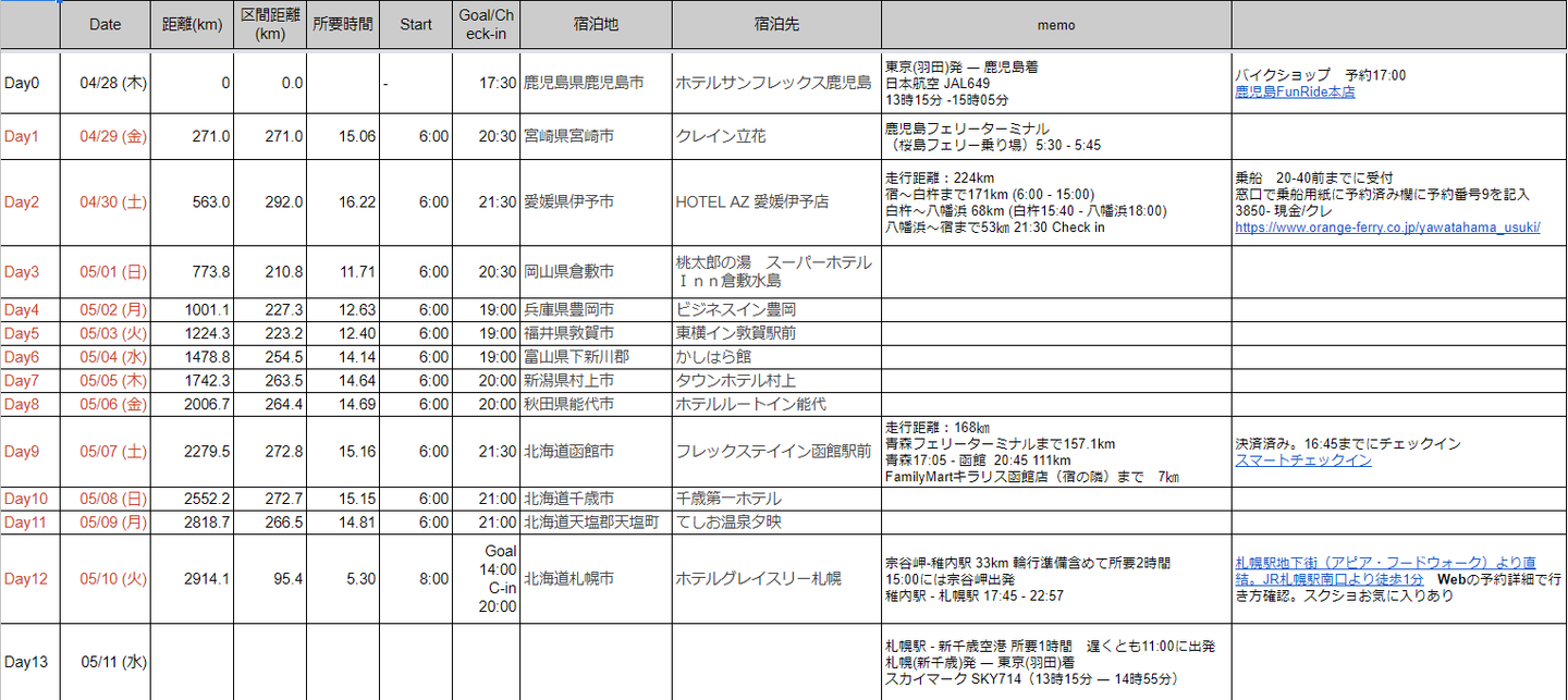 13日間の予定ですが、Day0として4/28に仕事を終えてから移動、Day12、13の後半に余裕を作る計画を立てました。グロス平均スピード(信号や食事休憩など停車時間を含む平均速度)は18㎞/hを想定。走行中は30km/hを維持するペースです。