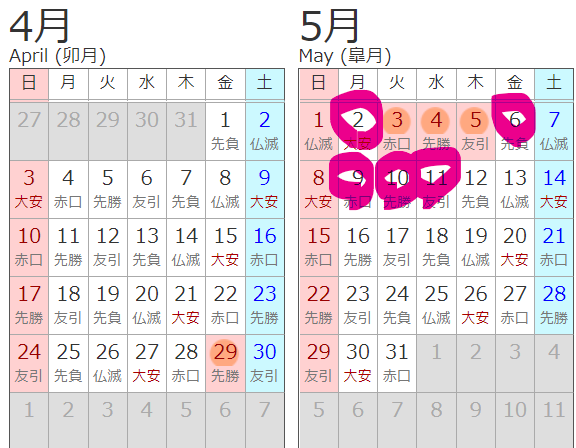 有給休暇を取得したのが赤丸部分、5/2, 6, 9, 10,11の5日間。