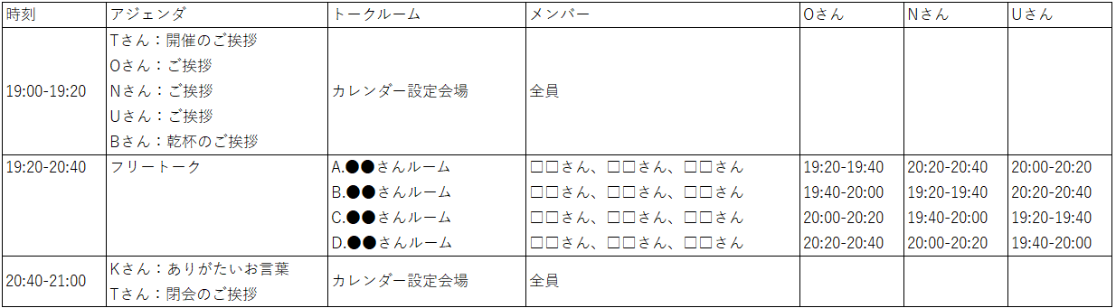 Teams会議でトークルームを複数用意し、主賓や管理職のメンバーが20分毎にルームをハシゴします。