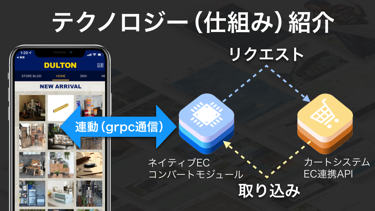 既存システムと連携し、ネイティブECコンバートモジュールに取り込みます。そこからYappliのアプリに出力。その際、gRPCを使用しているので、非常に早い通信速度を実現しています。現在提供しているWebビューのECと、開発中のネイティブECのスピードを比べると2倍以上の差がついています。