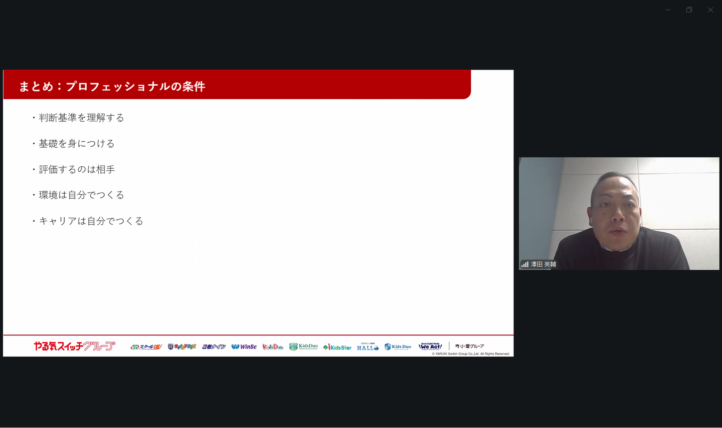 プロフェッショナルとは、成果だけでなく、相手にとって価値があるかを考え、基礎を大切にしながら成長し続ける姿勢を持つ人のこと。環境を与えられるものとして受け取るのではなく、自らつくっていく意識が重要だというメッセージが送られました。