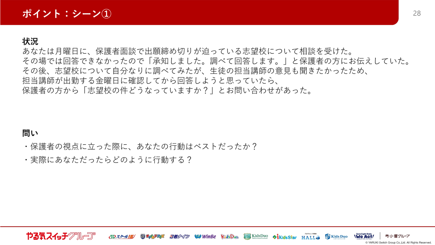 接遇や言葉遣い、実際に起こりうる場面を想定したケーススタディを通して、