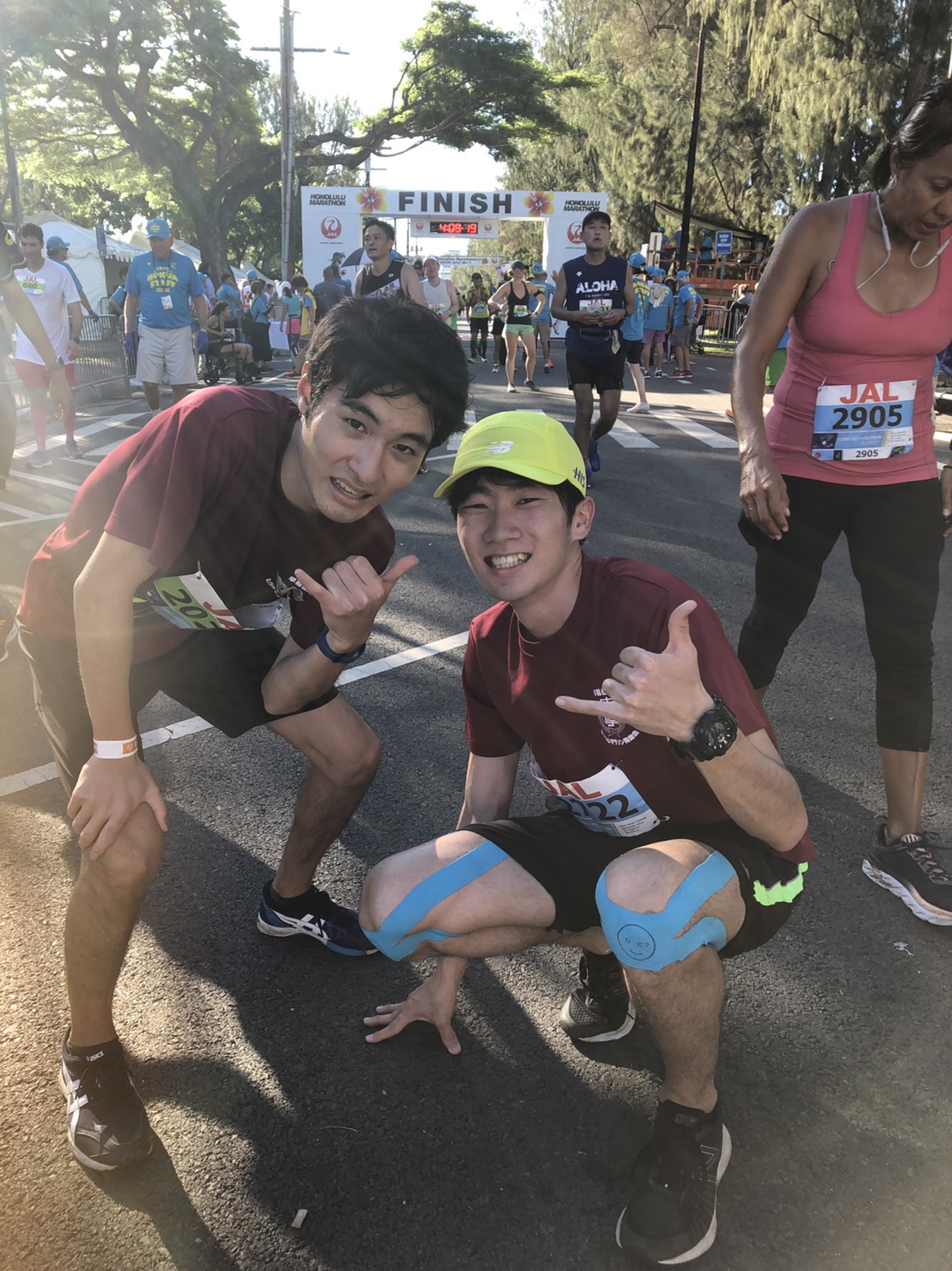 ↑大学4年でホノルルマラソンを完走した時の写真です。疲れから、だいぶ笑顔が引きつっています…。