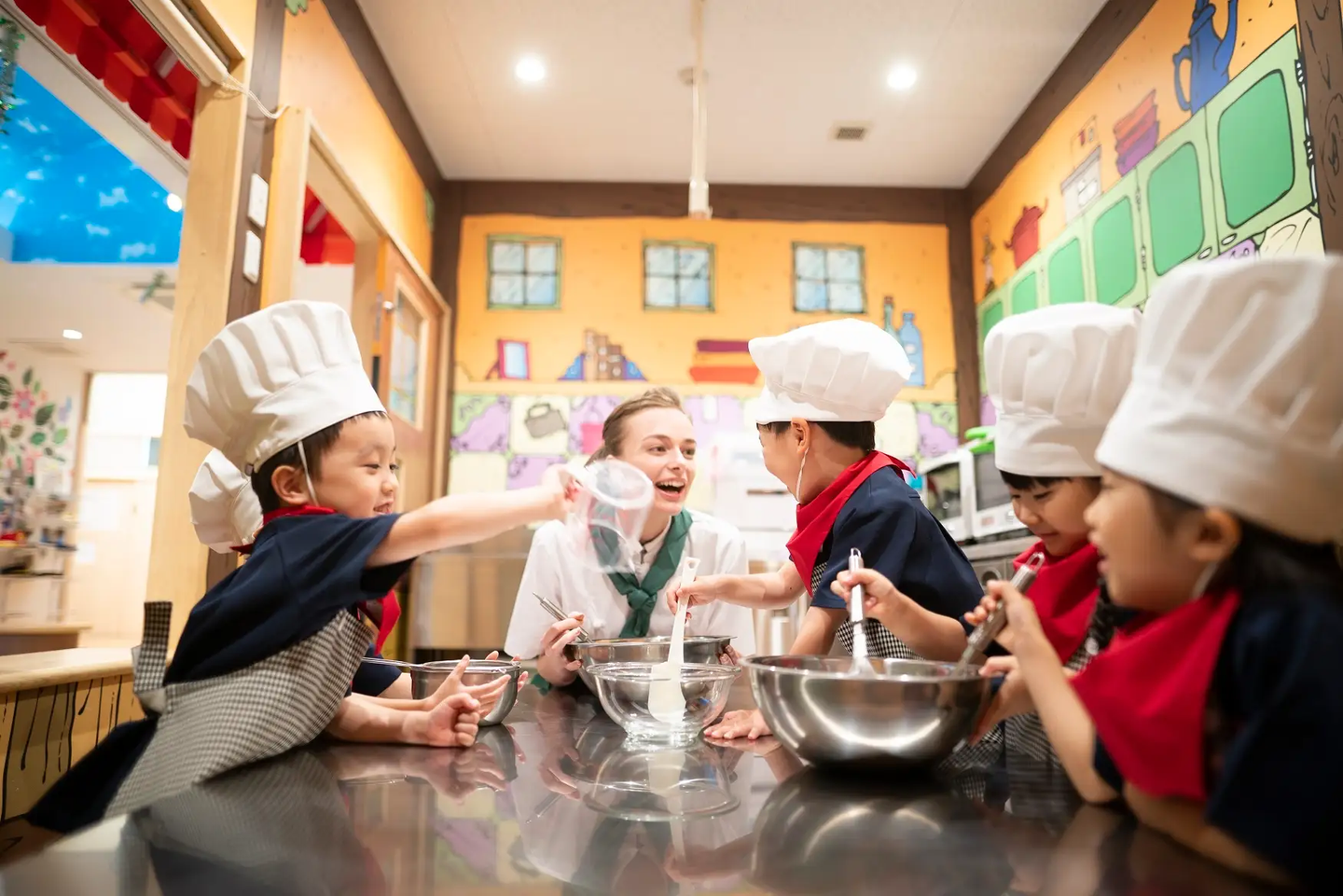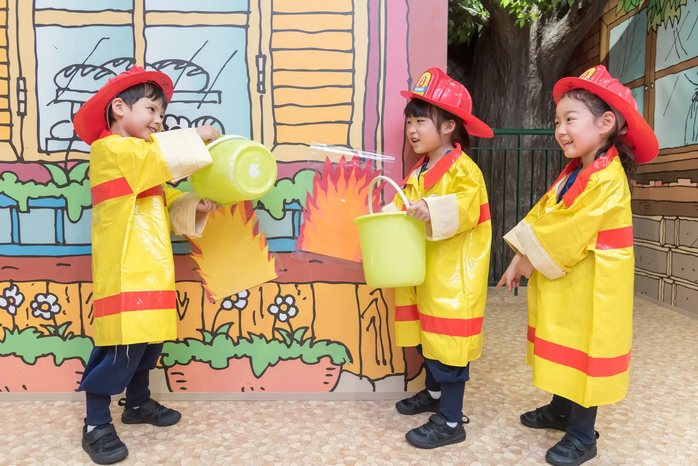Kids Duo International®では、園内にある職業体験施設で、英語を使った職業体験を毎週実施しています。警察官・消防士・お医者さん・考古学者・デザイナーなど、30種類以上の職業になりきることで、英語力を育みながら社会の仕組みを学び、将来の夢を描くきっかけを提供しています。