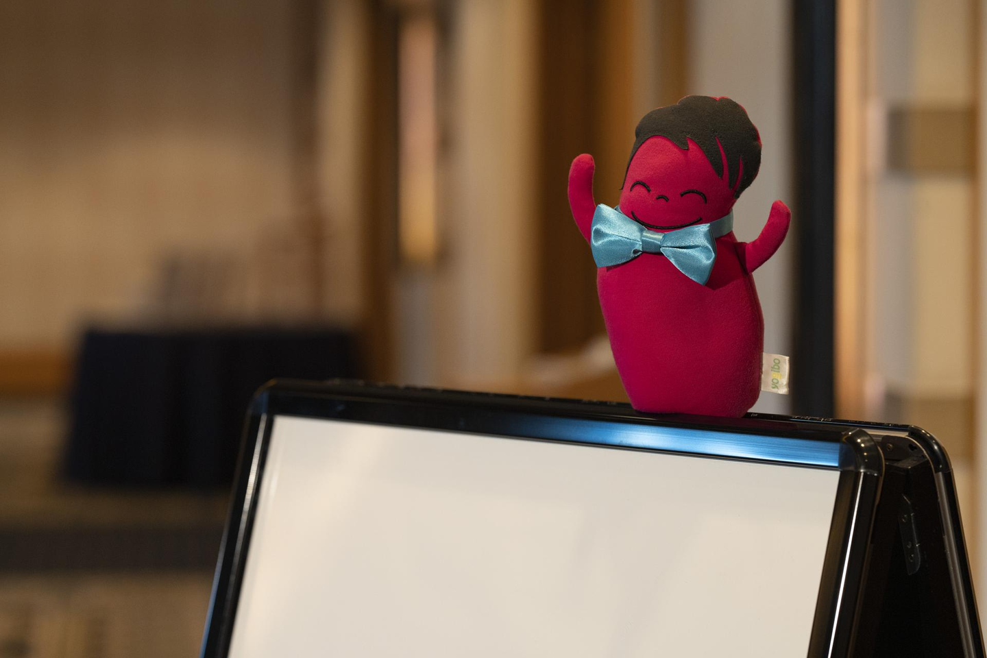 まず帝国ホテルにメンバーが到着すると、会場の入り口の看板に飾られたハギボーが可愛くお出迎えしてくれました。会場にはYogiboのビーズソファも設置され、休憩ができるようになっています。