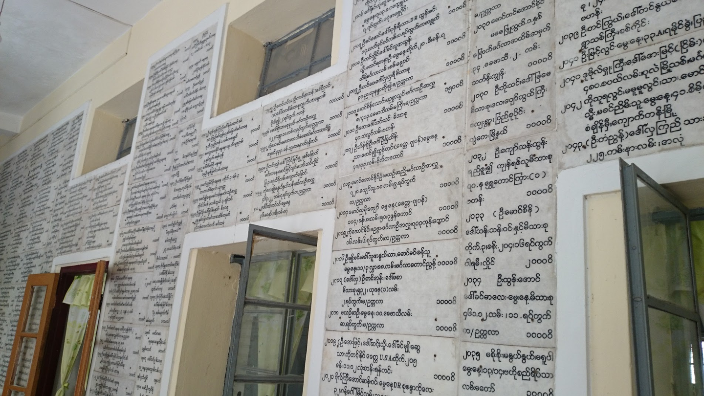 壁一面に書いている文字は、寄付をした人の名前と住所と寄付金の額です。寄付をした人はすべて、施設内に名前が残されます(なんと、この中には日本人の名前もあります!)。寄付をしたときの貢献を残すことで、より寄付をしてもらいやすくなっています。ミャンマーの施設では、施設内の壁の大半がこのように寄付者の名前で埋め尽くされています。