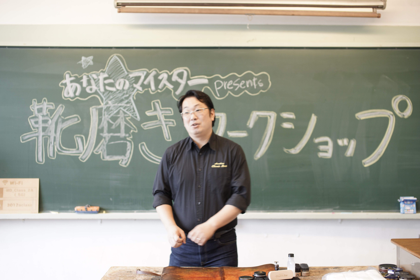 地元の中学校などでも職業体験の講師として登壇されているため、とてもわかりやすい説明に思わず「へえ〜」という声が会場に響きましたますはお手入れの前に、革靴についての基本知識の講義です。革靴の特性を始め、お手入れ用品の種類のご説明をいただきました。