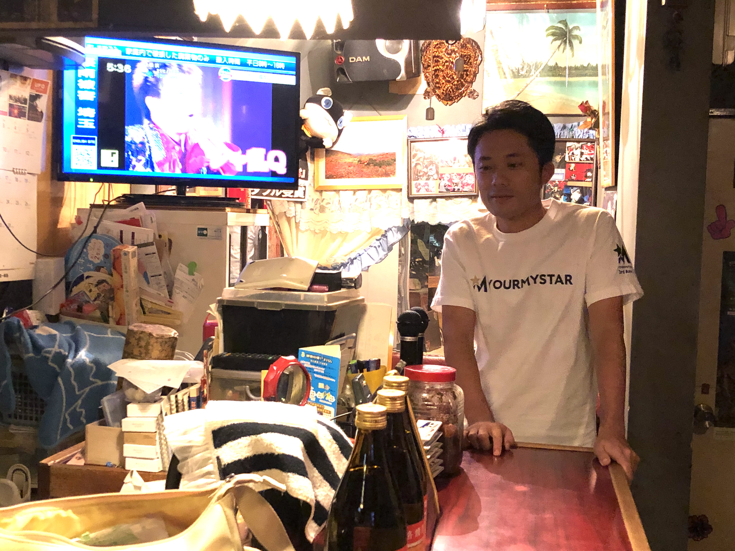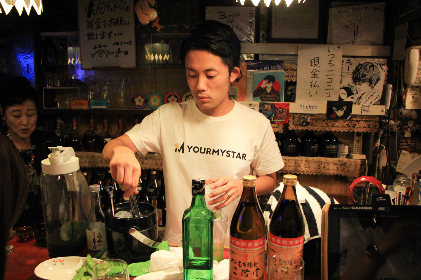 やや緊張気味の代表の星野。ゆあまいTを着て準備万端です!初回ということもあり、今回はメンバーよりも先に代表の星野だけお店に向かって準備。まずは恵子ママからスナック流のおもてなし方法やお酒の作り方などを伝授していただきます。