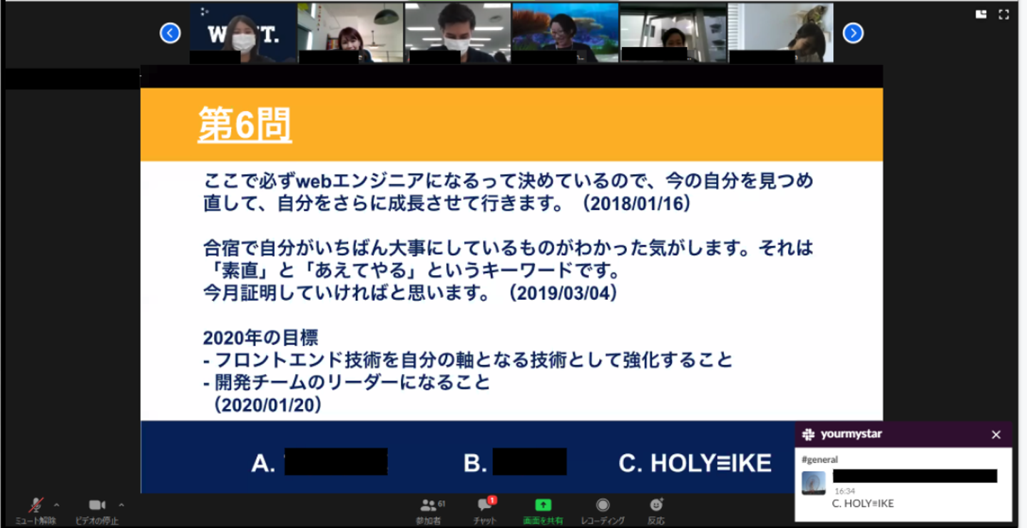 Zoomで画面共有をしながら設問を共有し、Slackでリアルタイムに選択肢を提示、各々正解だとおもう選択肢にスタンプを押す、というオンラインならではのコンテンツ。