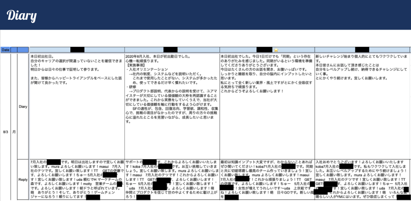 ユアマイスターでは全メンバーが「Diary」という日報を書いています。日報と言っても、ただタスクを報告するというよりもメンバー間のコミュニケーションに近い掲示板のようなイメージです。