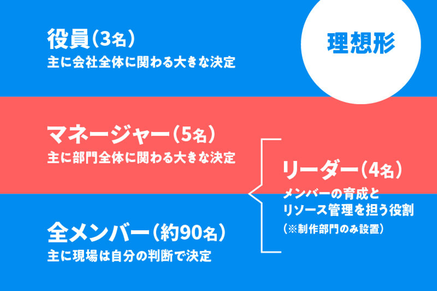 すでにこの構造で始まっています。一部、部門によってマネージャーとメンバーの間にリーダーという役割をおき、メンバーを成長させています。いずれ、全員がリーダーとして動けることが目的です。