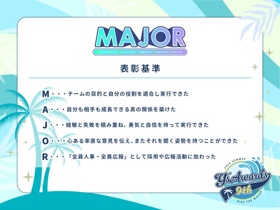 毎回恒例の最優秀賞と優秀賞の発表です。各部門の中からY'sの行動指針となる「MAJOR」に沿ったご活躍を、特にされている方に賞が贈られます。受賞されたみなさん、本当におめでとうございます。今後のご活躍も期待しています!