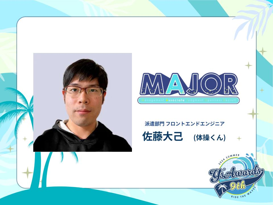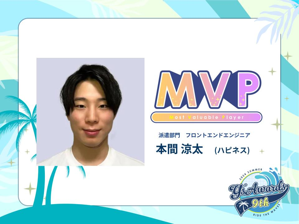 役員コメント:社内業務を多岐に関わる中でそれぞれの目的と自分の役割を適合し実行し、新しいカルチャー作りに前向きに取り組み、メンバーや研修生とも関係値構築し他メンバーとも互いに成長できるようなコミュニケーションをとってくれています。また、自ら挑戦し、次はどうしたらうまくいくかを試行錯誤しながら業務をしてくれています。ハピネスからは「次のAwardsでMVPを獲得したい」と宣言してくれましたね。その宣言通り、全ての領域で活躍してくれましたので、MVPとして表彰いたします。