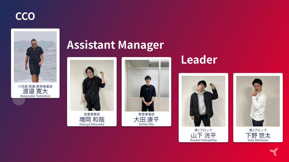 このたびの役職任命、本当におめでとうございます!みなさんがこれまで、リーダーシップを発揮し、メンバー全員の意見に耳を傾けながらも、的確に方向性を示してきた姿を見てきました。その姿勢が今回の任命に繋がったのだと、心から納得しています。