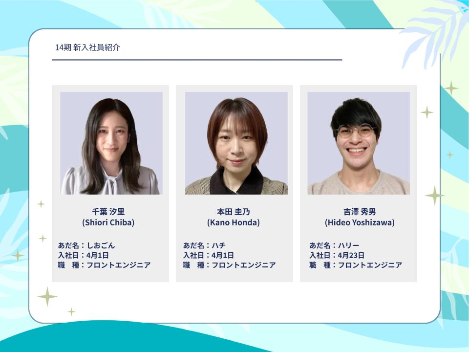 14期上期に入社をしてくれた社員の紹介がありました。切磋琢磨しながら一緒にビジョンを叶えていきましょう!
