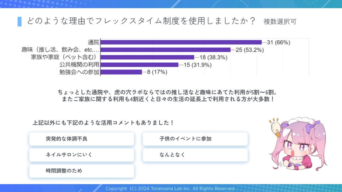 ご覧の通り、平日のちょっとした用事に活用している方や、とらラボならではの推し活など趣味に使っている方も多くいました。また、小さなお子さんをお持ちの社員も多く、子供のお迎えやイベントへの参加など、ご家族に関するイベントで活用している方も多くおります!(私も小学生の子供がいるので、非常に助かっています!)