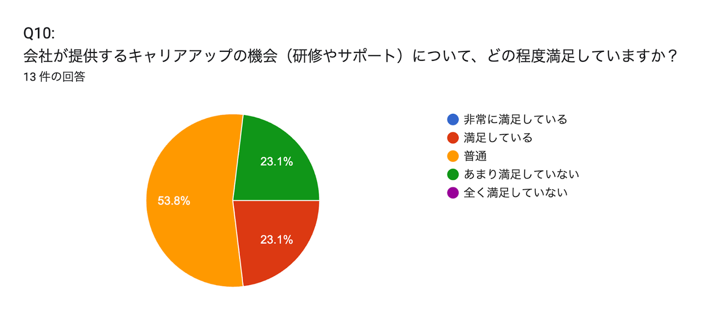 「会社が提供するキャリアアップの機会(研修やサポート)について、どの程度満足していますか?」という質問に対しては、「普通」と答えた社員が多く見受けられました。これに対し、社員からは「スキルアップのための時間を確保してほしい」といった具体的な改善提案が寄せられており、さらなる研修やキャリアサポートの充実が期待されています。