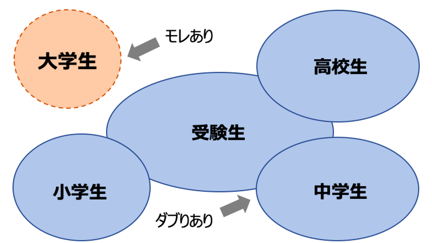 まず「大学生」という要素にモレがありますよね。また、「受験生」と「小学生」「中学生」「高校生」はダブっています。