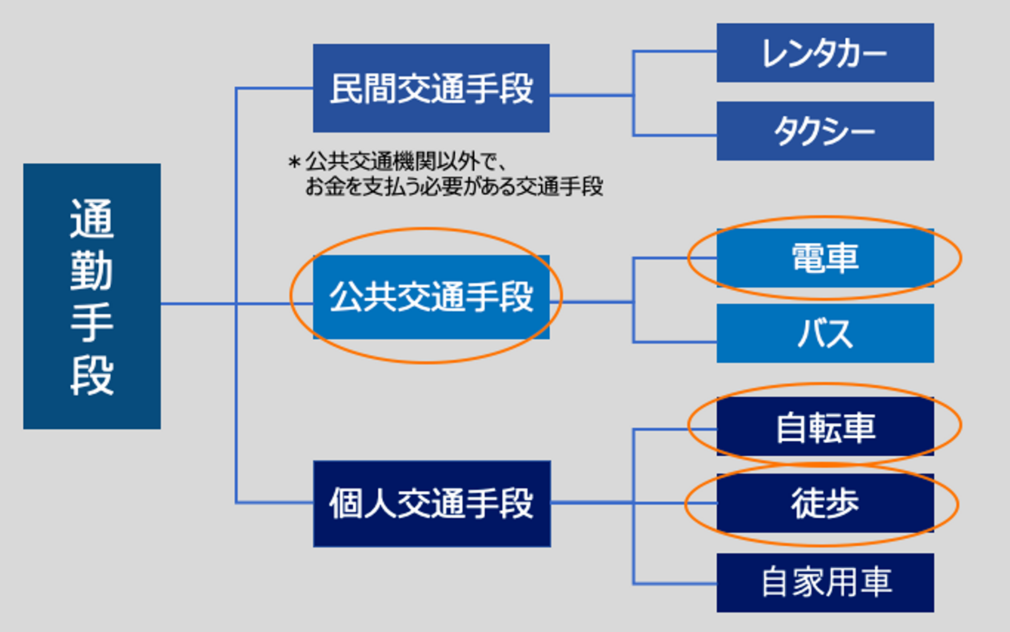 公共交通機関の中の1つに電車が含まれているので、公共交通機関と電車を並列にしているのは、ダブりがある状態です。さらに言うと「自動車」や「タクシー」などの通勤手段にモレがあることも分かるかと思います。