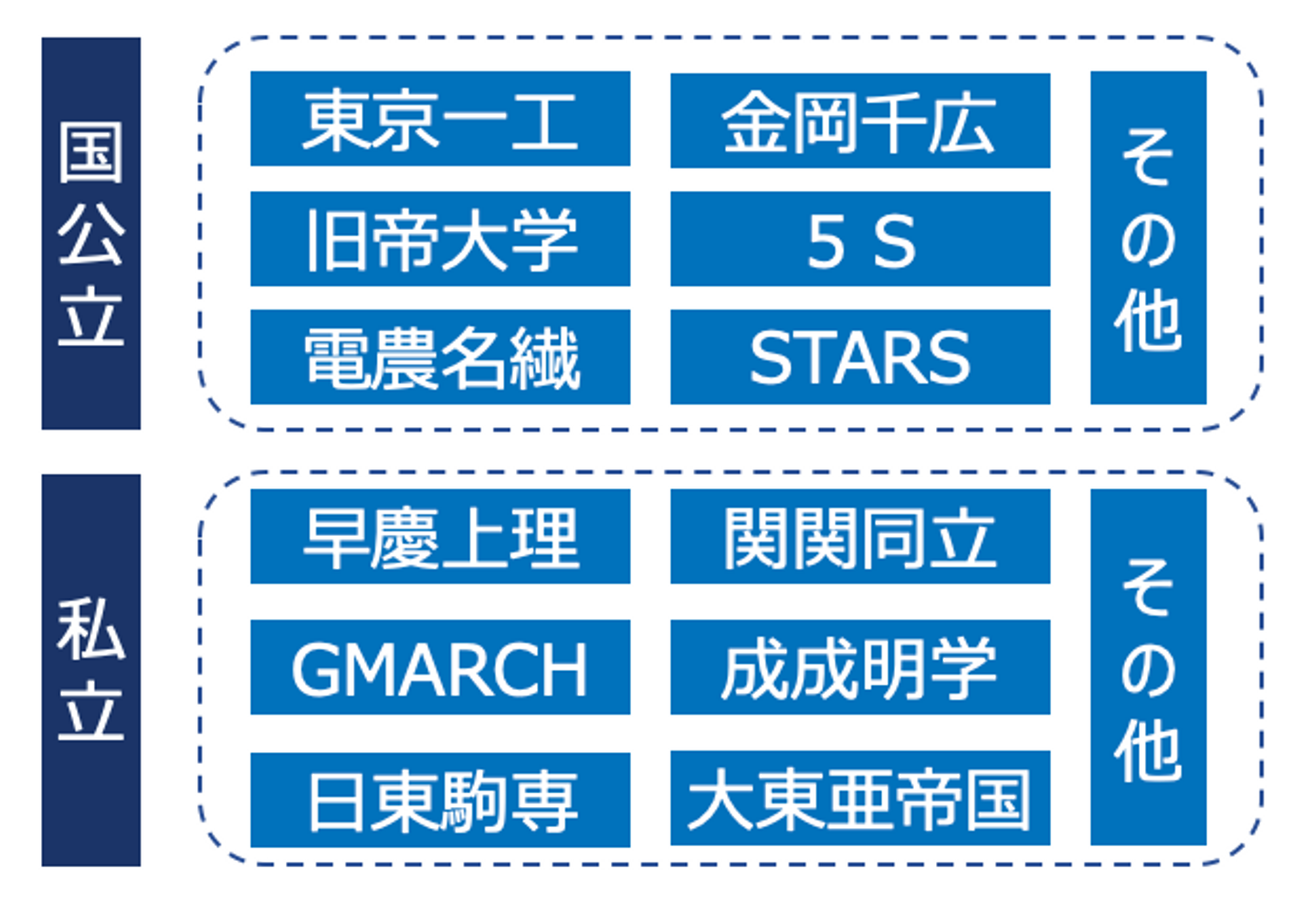 そして2つめに、「国公立」か「私立」かで分ける考え方があります。これだけだと簡単すぎるので、さらにそれぞれを大学群ごとに分解してみました。「その他」の括りはざっくりとしていますが、これもモレやダブりがないMECEな状態です。