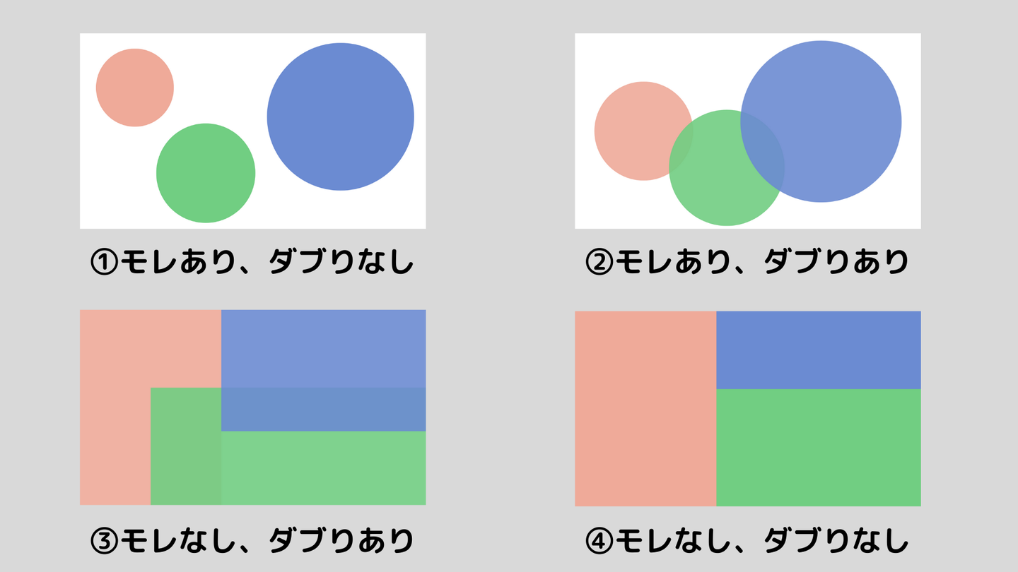 つまり、何か抜けている要素や被っている要素がなければ、それはMECEであるという風に言うことができます。イメージとしては以下の図の④に当たるものがMECEです。