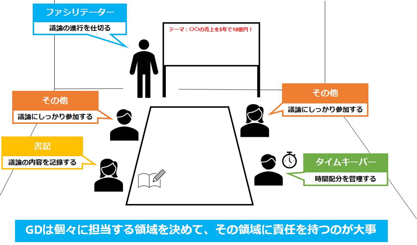 もちろん苦手を克服するという成長が目的で、あえて苦手なことにチャレンジする場合もあるかもしれませんが、わずか数時間しかないGDにおいてそれは不要と言えるでしょう。