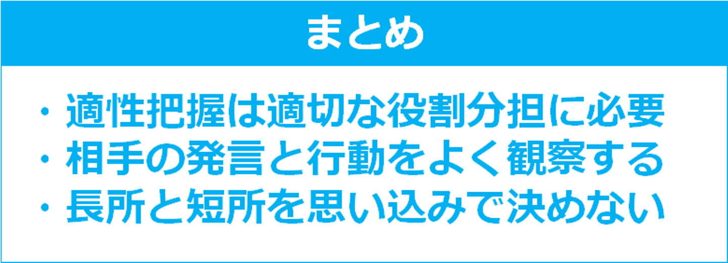 ちゃんと把握した適性をもとに、適切と思われる役割分担をするようにしましょう。
