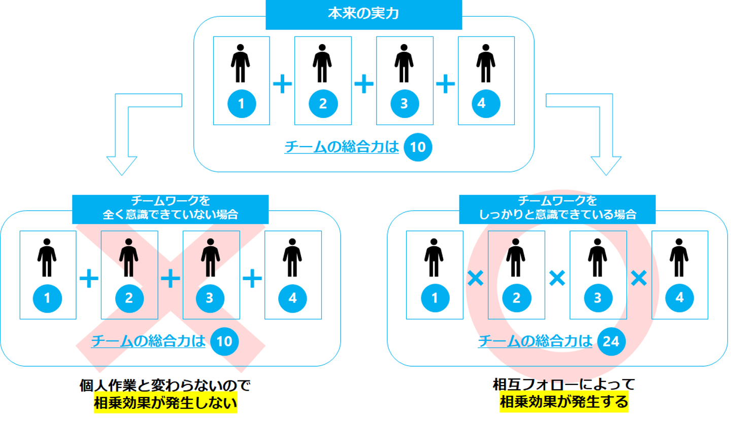 チームの総合力が単純に個人の能力の総和にとどまらず、かけ算的なミラクル(=相乗効果)が起こり得るということです。
