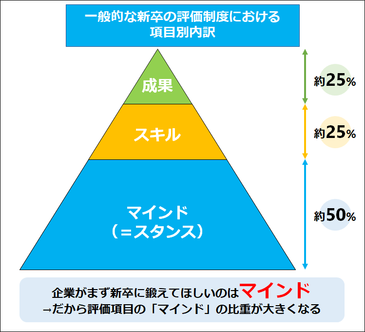 新卒のうちは一般的にマインドやスタンスといった評価の比重がほとんど占めています。